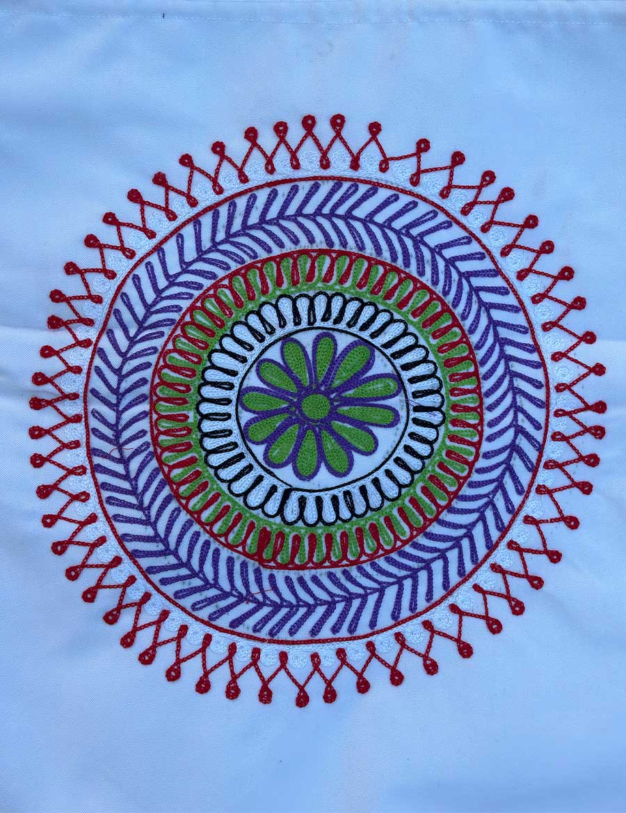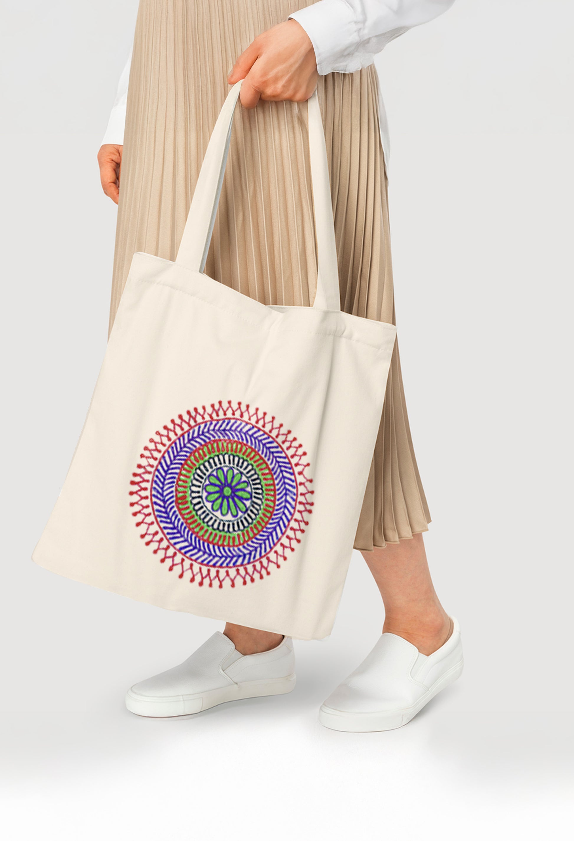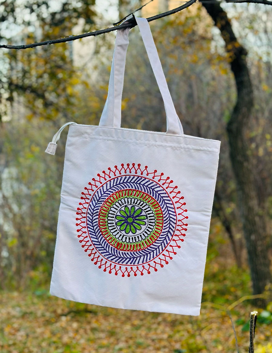 The Chakra tote bag by RêveSak. Handcrafted from pure cotton and canvas, featuring a zip closure, two pockets, and extra durability. Available in multiple sizes.