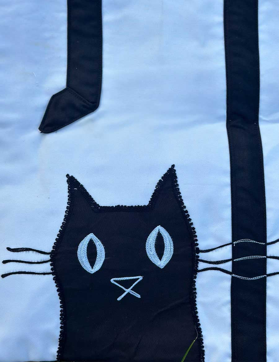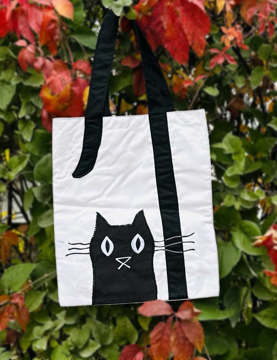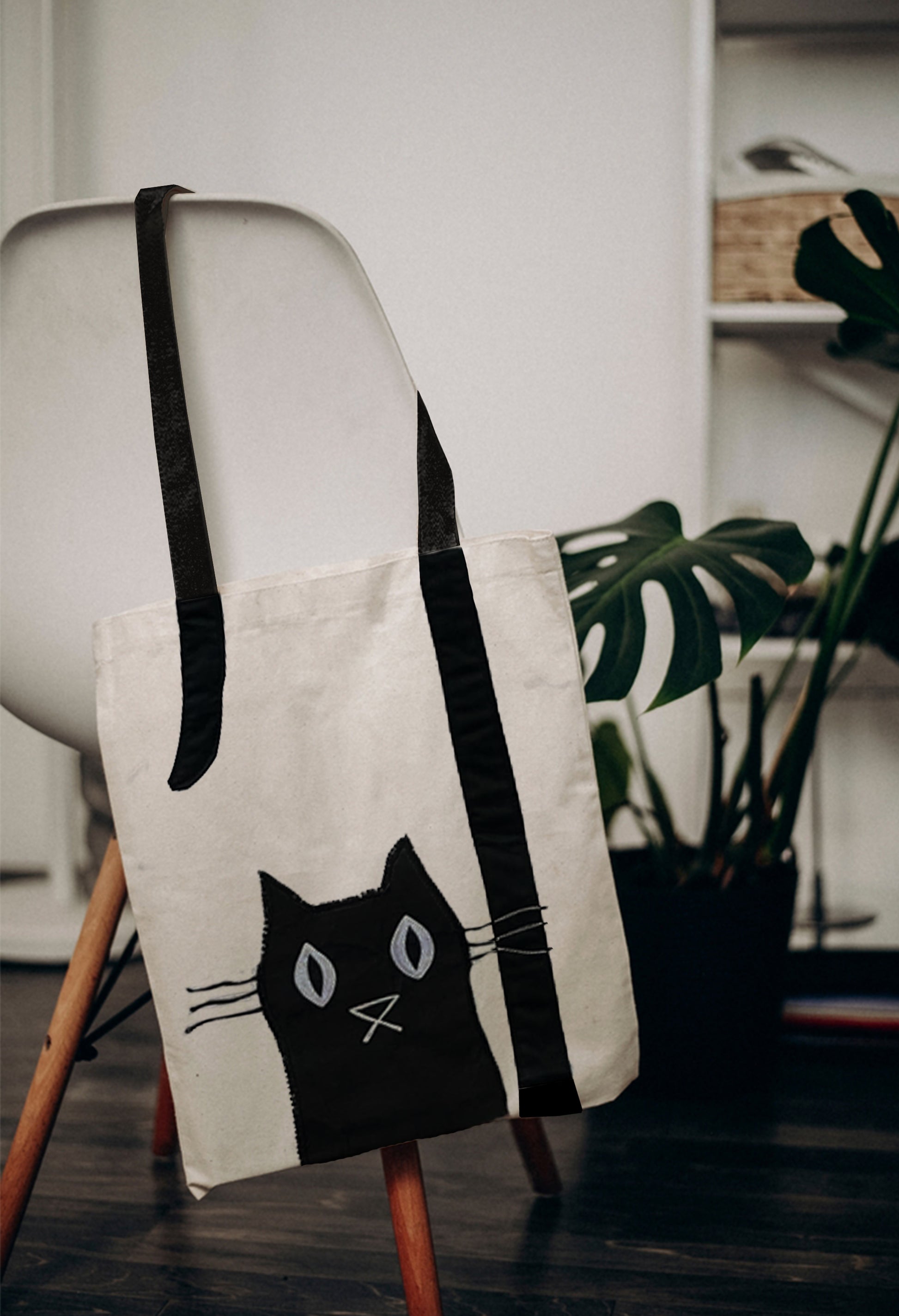 The "Miaow" tote bag from RêveSak is a handcrafted accessory made from pure cotton and handpicked canvas. It features a zip closure, two pockets for convenience, and an extra layer of fabric for added durability.
